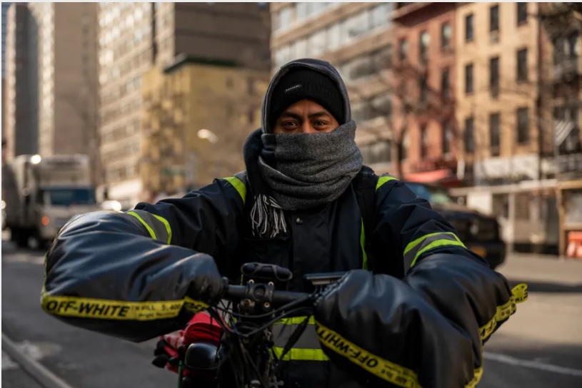 Gabriel Lopez, who has been making a living as a food delivery worker for over 18 months, braved the elements in Midtown, Jan. 21, 2022. Hiram Alejandro Durán/ THE CITY