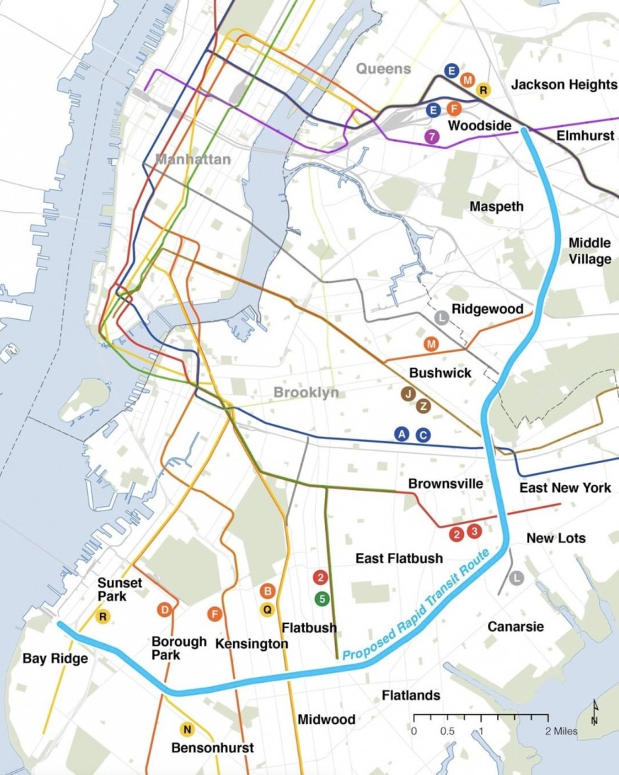 The Interborough Express would utilize a portion of the Bay Ridge Branch freight rail that runs north-south through Queens and Brooklyn.