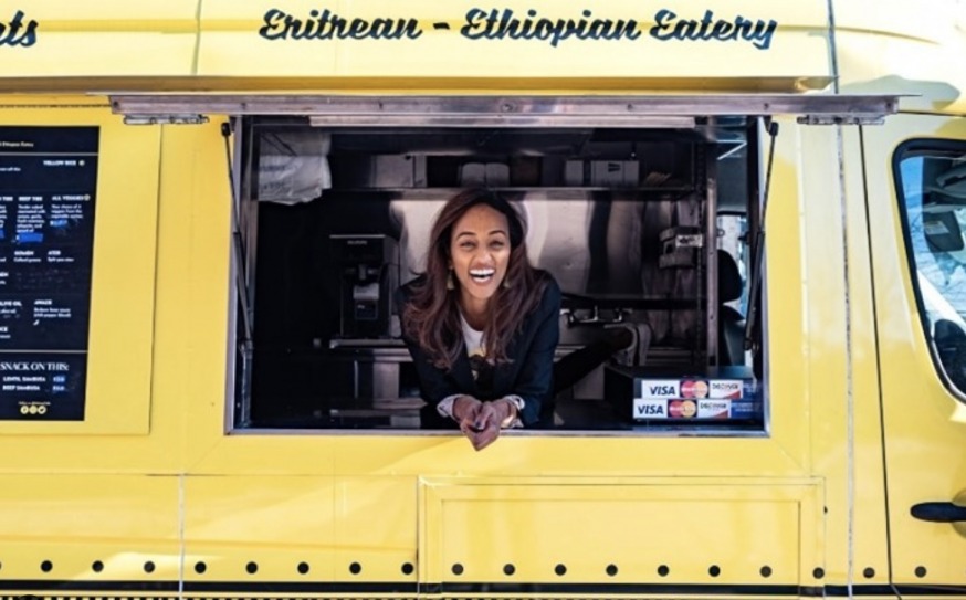 Eden Egziabher, the founder and owner of Makina Cafe, in one of the business’s two food trucks (Courtesy of Makina Cafe)