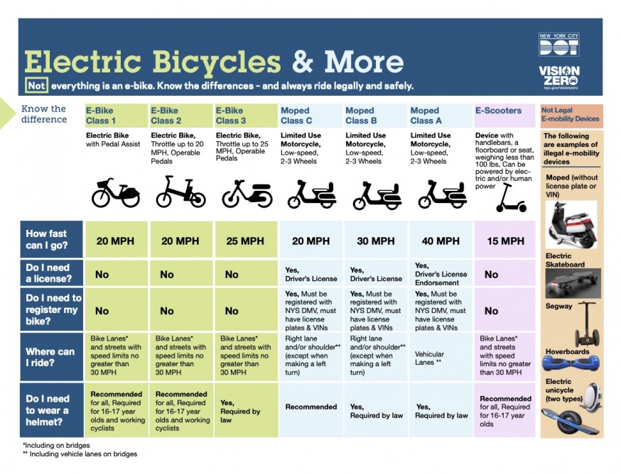Mopeds, motorcycles and other vehicles that require a license plate and DMV registration are banned from bike lanes by law. E-bikes and e-scooters, however, are permitted on bike lanes.