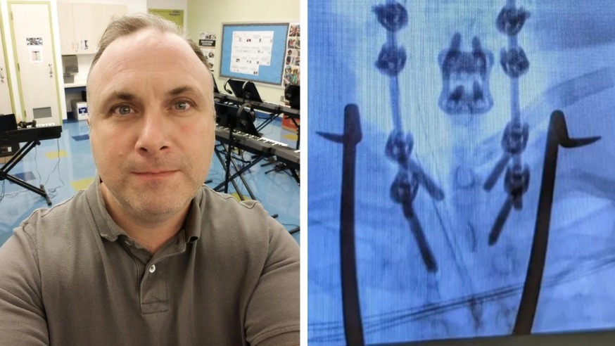 A GoFundMe page has been launched for Gerasimos Gianutsos, pictured, a Long Island City music teacher who broke his neck in a freak accident earlier this month that has left him paralyzed. An X-ray image of his injuries (R) (Photos via mistergmusic.com (L) and GoFundMe (R))