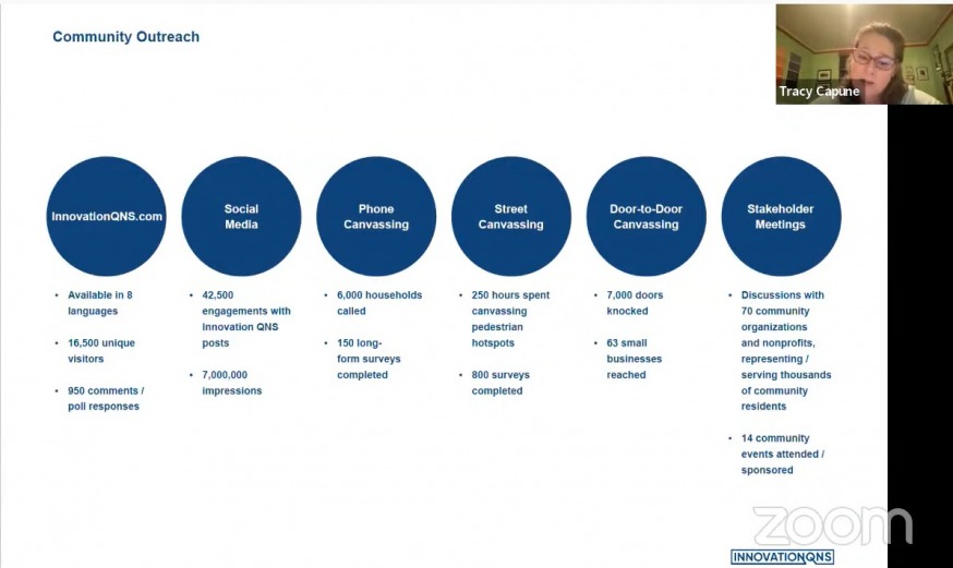 She said they created a website called InnovationQNS.com that provides information on the plan in eight languages; done outreach via social media that has led to 42,500 engagements; conducted phone canvassing that has reached 6,000 households; done 250 hours of street canvassing in neighborhood hotspots; knocked on 7,000 doors; and had discussions with 70 community organizations and nonprofit groups, which represents thousands of community residents.