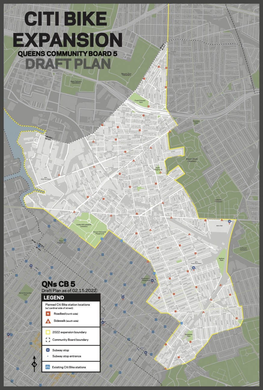 The map — which is not final — was first unveiled at a Queens Community Board 5 joint Transportation and Public Transit Committees meeting on Feb. 15. The DOT said that it plans to start installing the stations by the summer.