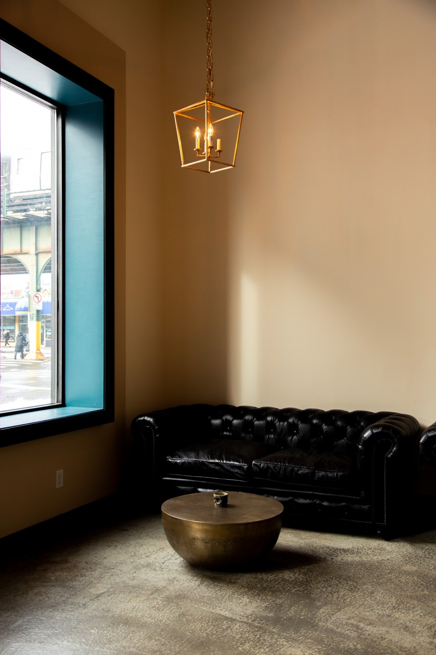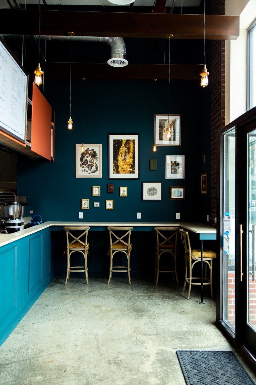 The café has a high ceiling and the counter area — as well as one side of the wall – is painted in a dark teal color mixed with exposed brick. The rest of the space is painted in bright cream and there are a number of low-hanging Edison lights. There are four high stools and two large sofas inside the premises.