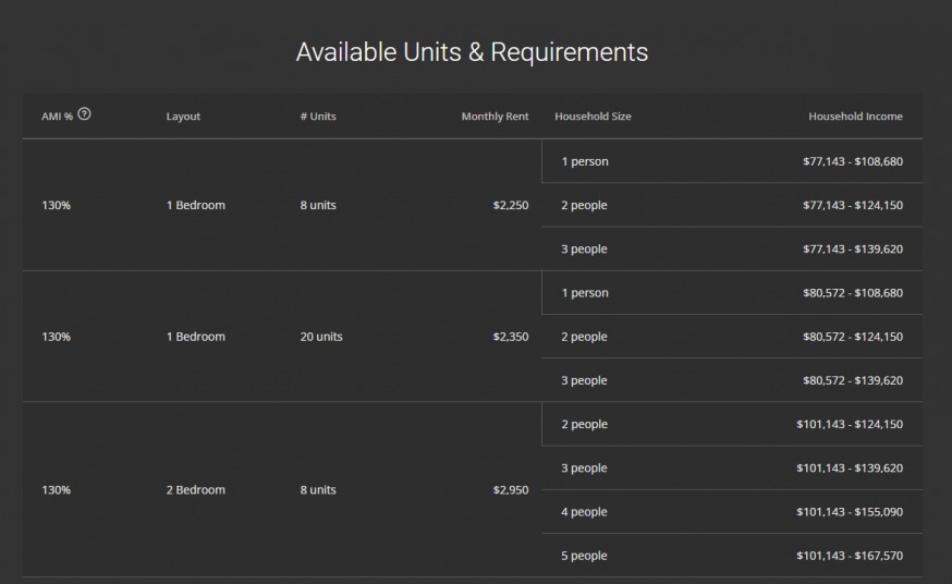 The units are not for low-income earners. To qualify, applicants must earn 130 percent of the Area Median Income—or $77,000 for an individual through to $167,600 for a family of five—to be eligible for a unit.