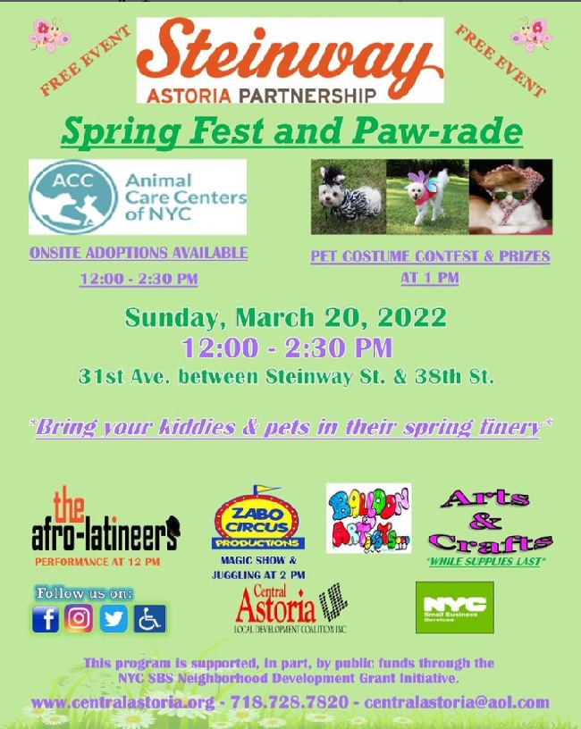 The Steinway Astoria Partnership is hosting a “Spring Fest and Paw-rade” event on 31st Avenue, between Steinway Street and 38th Street, to welcome the first day of spring on Sunday, March 20.