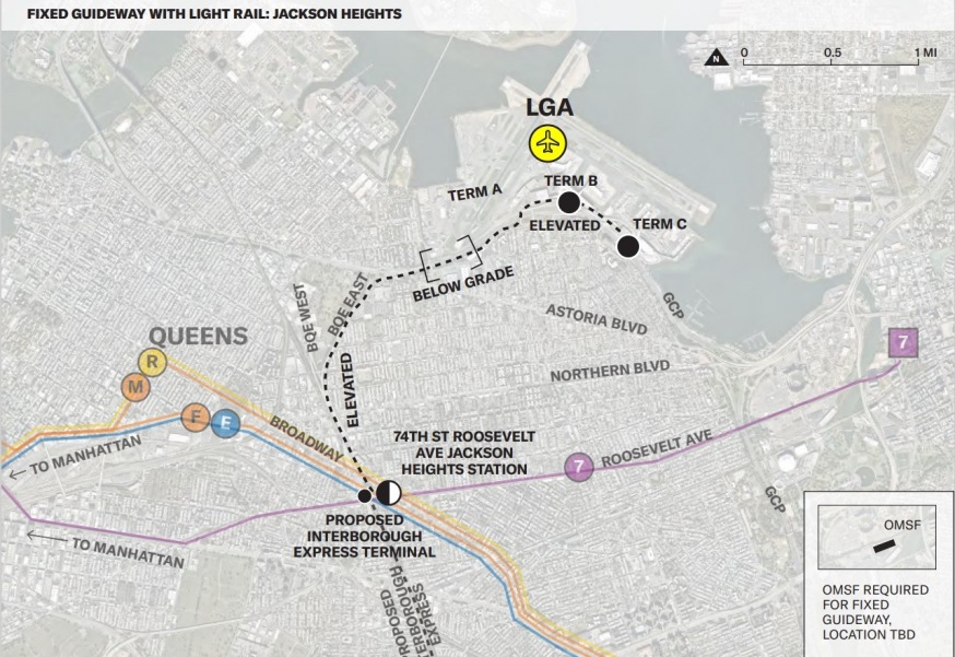 The last light rail option the agency proposed would take riders from Jackson Heights to LaGuardia. It would start at the 74th Street Roosevelt Avenue-Jackson Heights E/F/M/R/7 station and run along elevated tracks over the Brooklyn Queens Expressway to reach the airport.