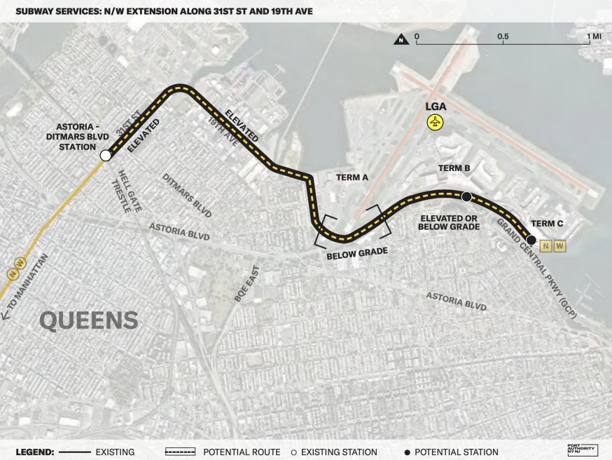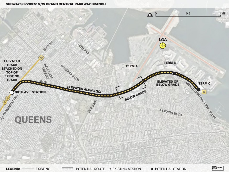 One subway-based proposal is to extend the N/W line from the 30th Avenue station to the airport via elevated tracks along the Grand Central Parkway. The other suggested subway option is to extend the N/W line from the Astoria-Ditmars Boulevard station to the airport via elevated tracks along local streets like 31st Street and 19th Avenue.