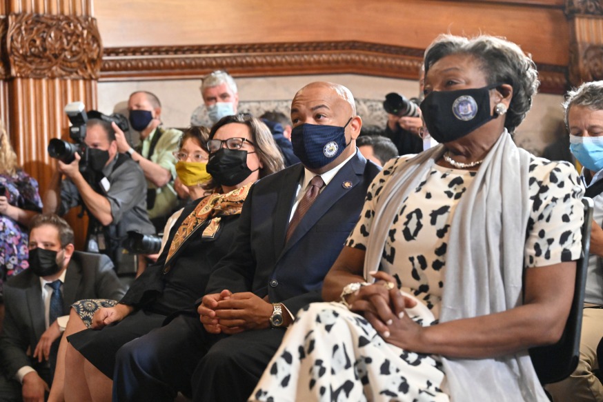 Assembly Speaker Carl Heastie and Senate Majority Leader Andrea Stewart-Cousins watch as Kathy Hochul is sworn in as governor, August 24, 2021. Kevin P. Coughlin/Office of the Governor