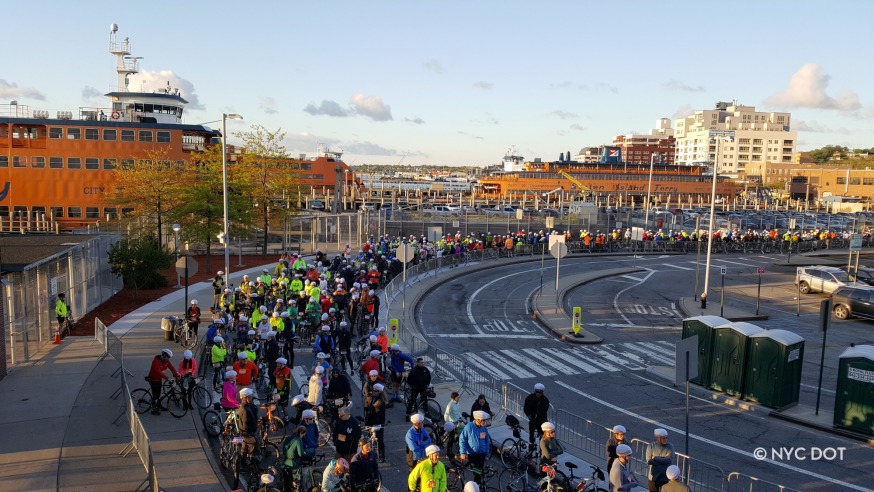 The TD Five Boro Bike Tour starts in Lower Manhattan and goes through all five boroughs finishing on Staten Island (DOT)