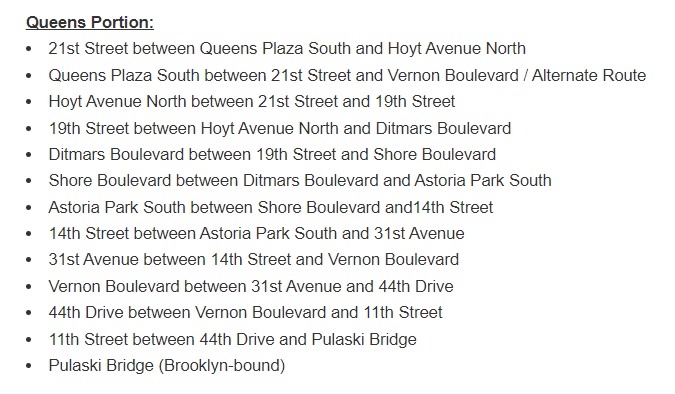 To accommodate the tour, the Department of Transportation has announced that the following streets in western Queens will be closed on Sunday between 7:30 a.m. and 2 p.m., at the discretion of the NYPD.