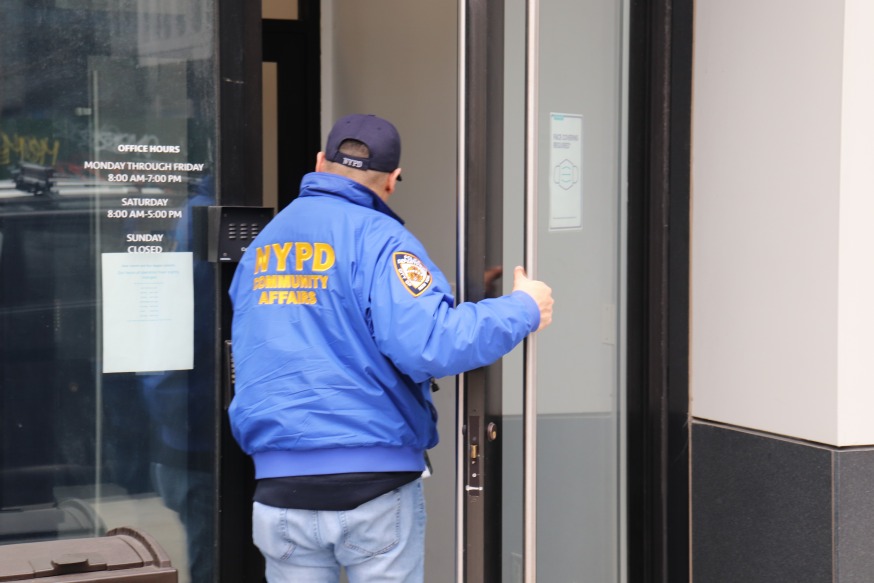 Police were seen going door to door today asking surrounding businesses if they had been hit by the suspects (Photo by Michael Dorgan, Queens Post)