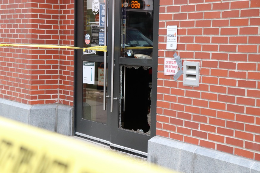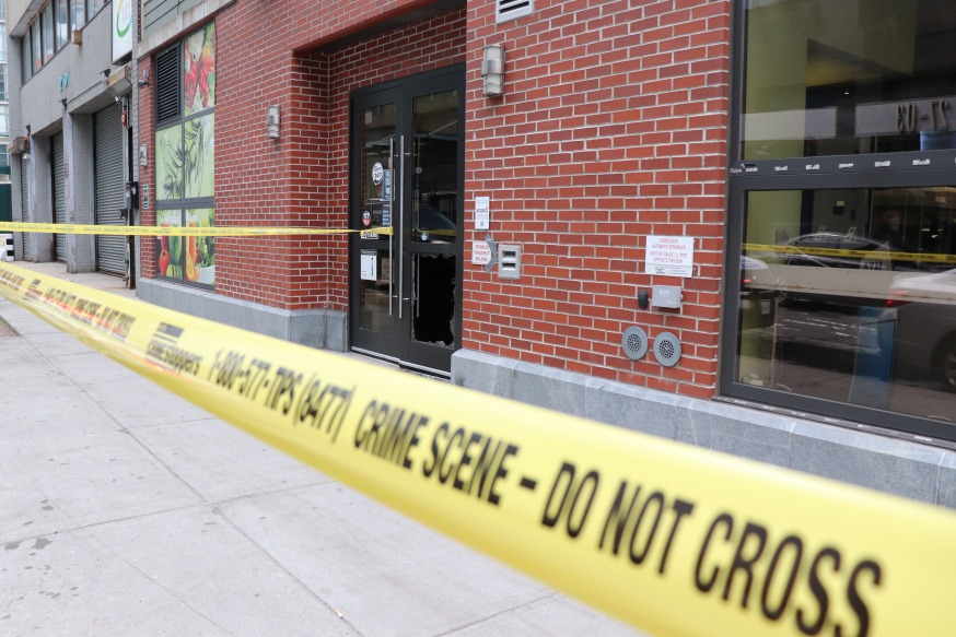 Instead of opening up for the day’s trade, the business owners were seen sweeping up shattered glass and speaking to the NYPD as the front of their establishments were cordoned off with yellow police tape.