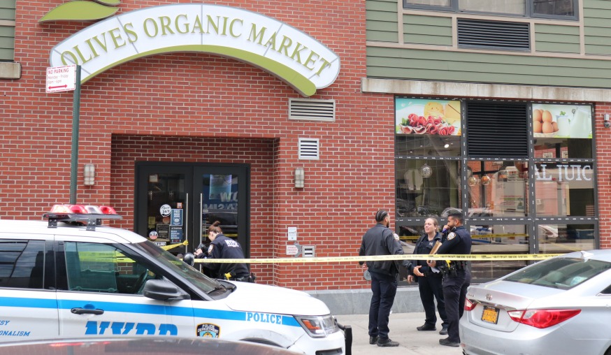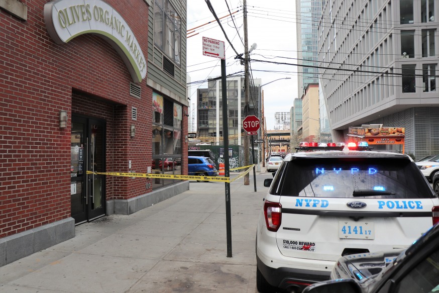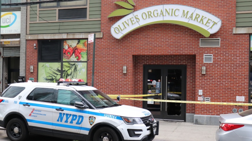 Police outside Olives Organic Market, a deli located at 42-37 27th St. (Photo by Michael Dorgan, Queens Post)