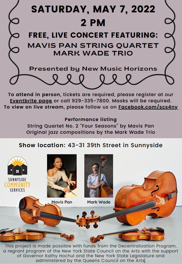 The concert is being organized by SCS and New Music Horizons, a non-profit music group established by Wade that promotes the work of emerging and mid-level musicians.