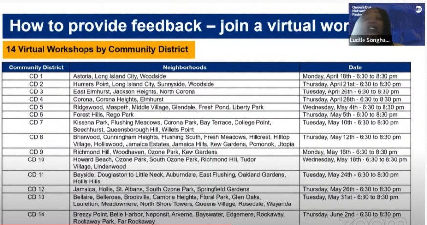 She said the MTA will also host virtual workshops for each community board district beginning with Community Board 1 on April 18 and finishing with Community Board 14 on June 2. She said residents can provide feedback to the plans at the workshops.