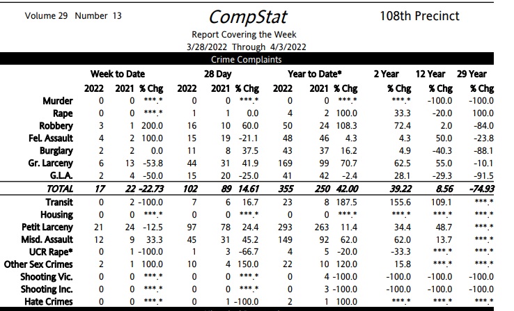 NYPD crime stats in the 108th Precinct, which covers Sunnyside, Woodside and Long Island City