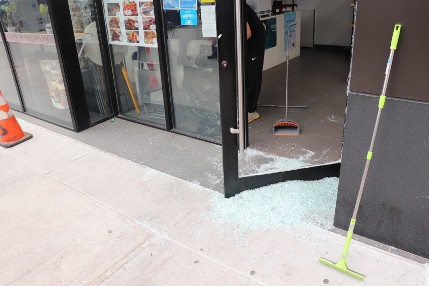 Smashed glass outside Möge Tee, a bubble tea store located at 42-38 Crescent St. that was burglarized last week (Photo by Michael Dorgan, Queens Post)