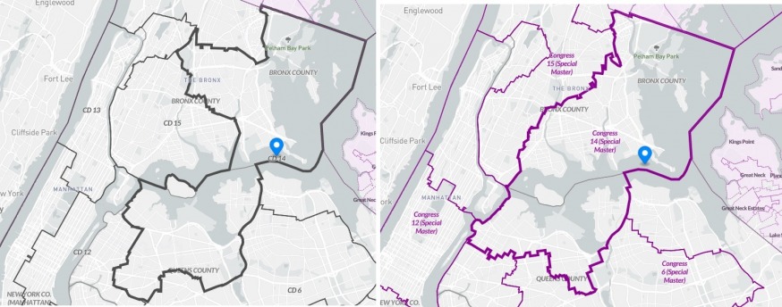 Congressional District 14. The existing map is on the left, with the revised map to the right. The revised map cuts out Sunnyside, Woodside and most of Jackson Heights (Source: REDISTRICTING & YOU: New York)