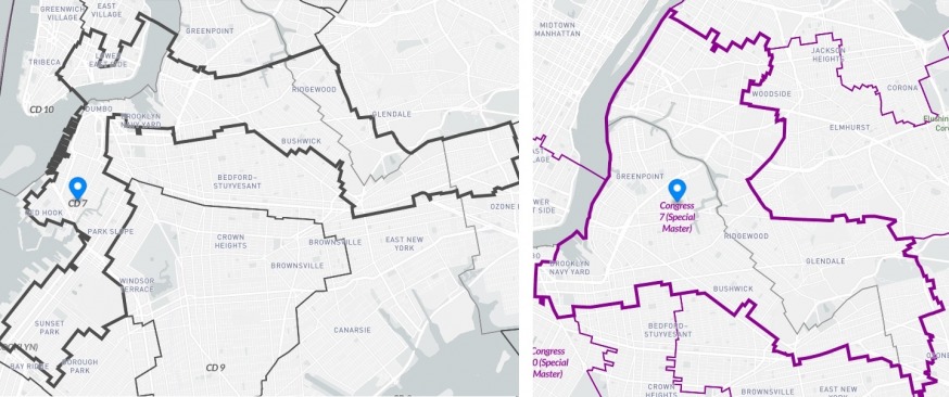 Congressional District 7. The existing map is on the left and snakes its way through Brooklyn, Manhattan and Queens. The new map drawn by the special master is on the right (Source: REDISTRICTING & YOU: New York)