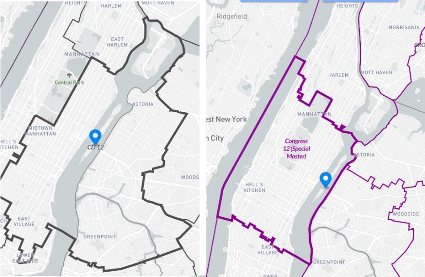Congressional District 12. The existing map is on the left and the map drawn by the special master is on the right. The map drawn by the special master cuts out all of Queens and Brooklyn (Source: REDISTRICTING & YOU: New York)