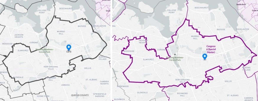 Congressional District 6. The existing map is to the left, with the revised map to the right. The revised map includes Woodside and most of Jackson Heights, but no longer includes Bayside (Source: REDISTRICTING & YOU: New York)