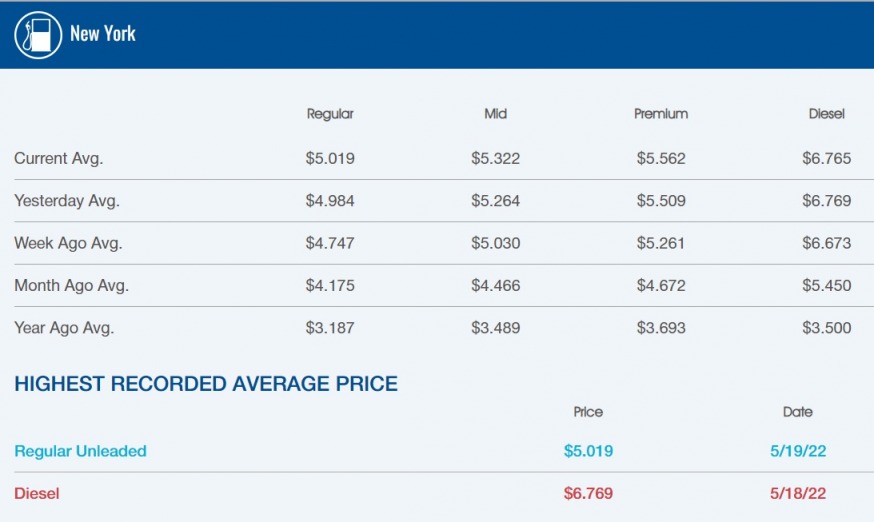 The average price for regular gas in New York City is now $5.02 a gallon—an all-time high–according to AAA. The average in Queens is $5.02 a gallon, Staten Island $4.99, the Bronx $4.98, Brooklyn $5.01 and Manhattan $5.35.