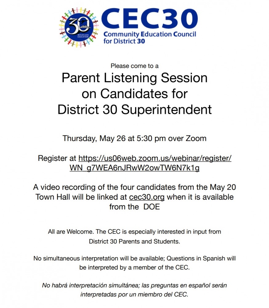 Disgruntled parents will be holding a “listening session” Thursday to discuss the four candidates vying to be the next Superintendent for District 30 schools in western Queens.