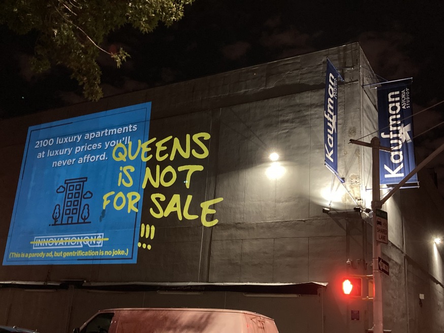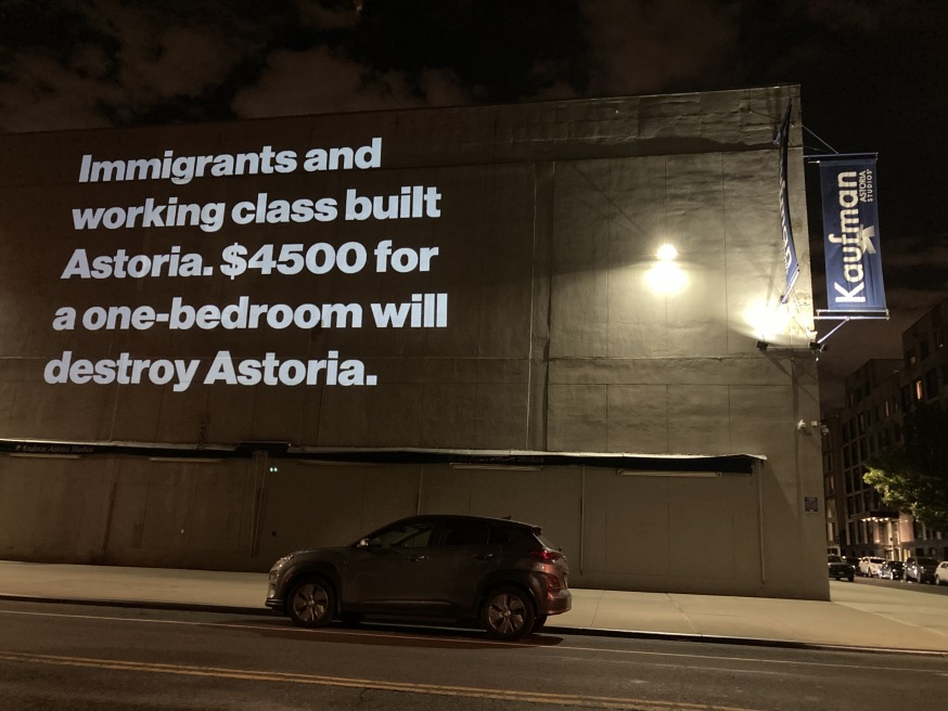 The artists projected enormous messages on the side of one of the Kaufman Astoria buildings in Astoria that were highly critical of the $2 billion development proposal that would bring 2,800 apartment units, as well as office, retail and community space to the Steinway Street/35th Avenue district.