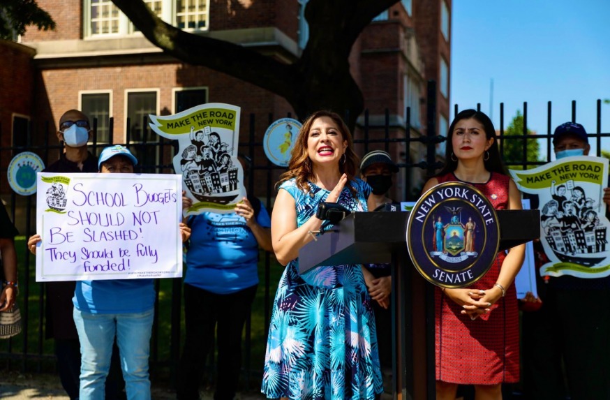 Elected officials and local parents hold a rally outside P.S 69 in Jackson Heights to protest the upcoming budget.cuts to NYC’s public schools. Assemblymember Jessica González-Rojas speaking with State Sen. Jessica Ramos alongside her (Photo: Jessica González-Rojas Retweeted (Photo: twitter @votejgr)