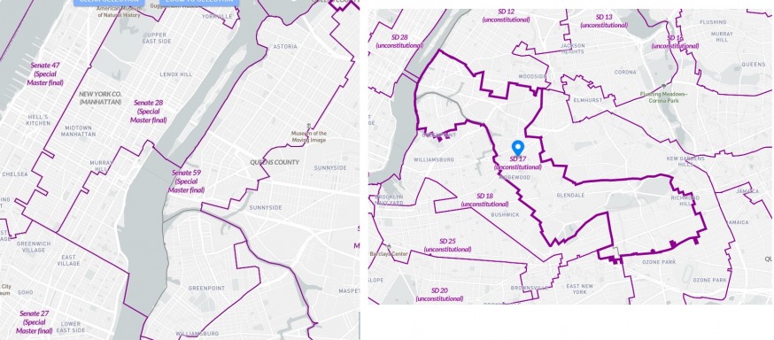 Senate District 59, created by a court appointed special master, is on the left. The proposed Senate District 17, on the right, was drafted by state Democrats and ruled unconstitutional (RedistrictingandYou)