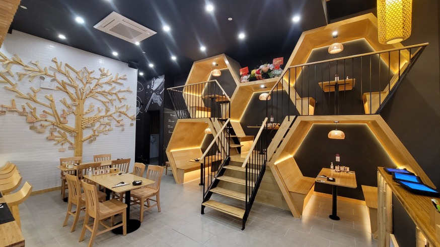 There is a counter on the left-hand side of the dining area overlooking the kitchen while on the right-hand side there is a “bee-hive” designed seating area that consists of five booths, three of which are elevated.
