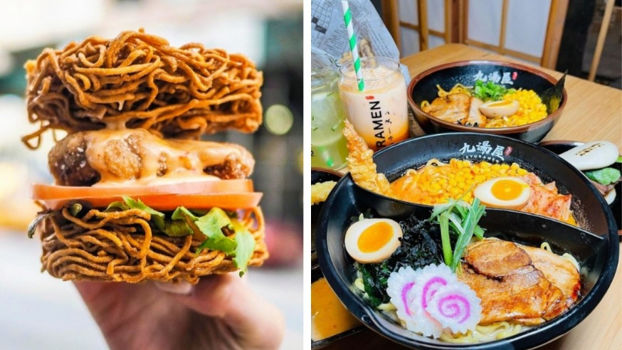 A Kyuramen burger (L) and ramen bowls (R) (Photos via Instagram)