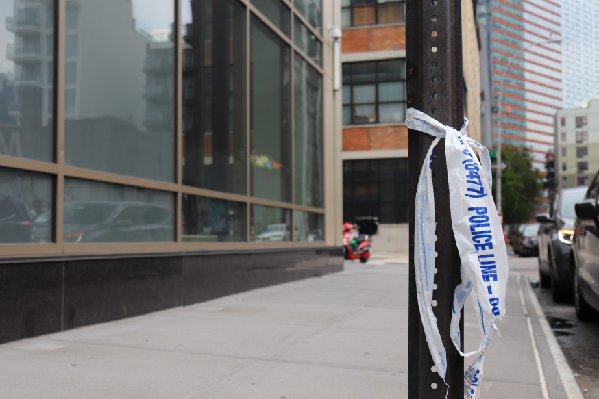 Leftover police tape at the crime scene today (Photo: Michael Dorgan, Queens Post)