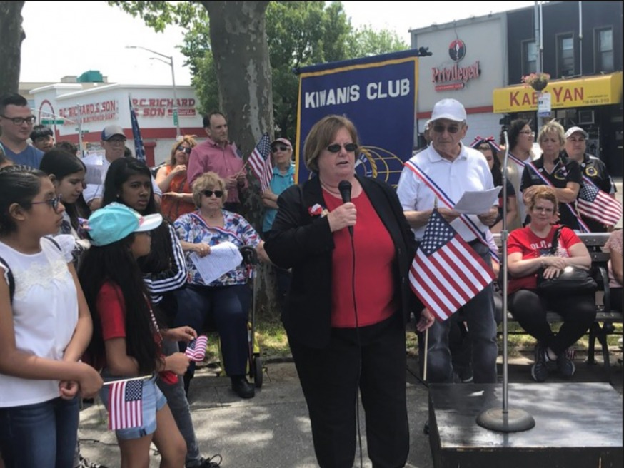 Assemblymember Cathy Nolan addressing the crowd at the conclusion of 2019 Sunnyside Flag Day Parade (QP files)