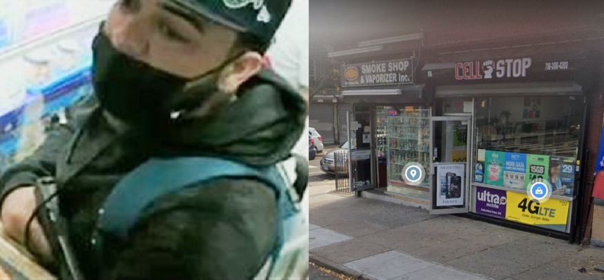 Police are looking for a man (pictured) who allegedly robbed a smoke shop in Ridgewood at gunpoint Sunday night (Photo: NYPD and GMaps)