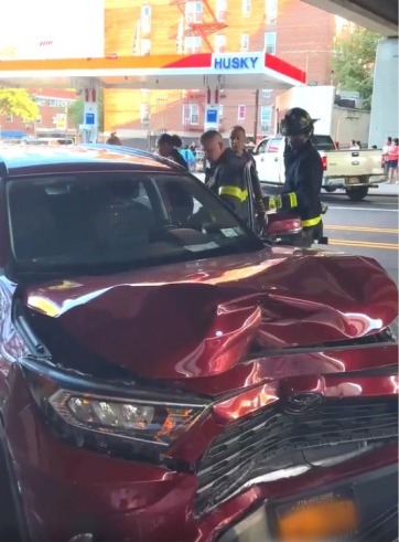 Video from the scene shows the RAV 4 stuck against the sidewalk with its hood smashed in and a front tire blown. Debris can be seen strewn across the middle of the road and there are tire marks leading to the vehicle.