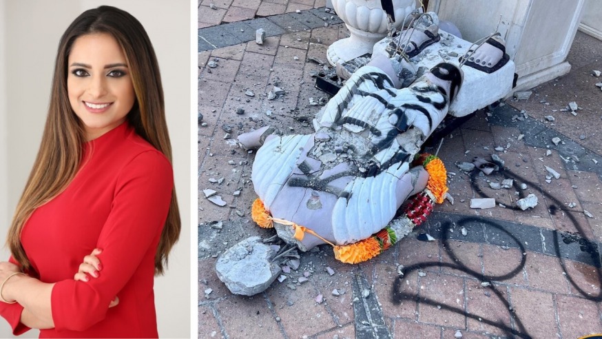 Assemblymember Jenifer Rajkumar (L) has called for the immediate arrest of six men who are wanted by police for destroying a statute of Mahatma Gandhi with a sledgehammer in South Richmond Hill Tuesday (Photos: Jenifer Rajkumar via jeniferforny.com and the vandalized statue via Cityline Ozone Park Civilian Patrol)