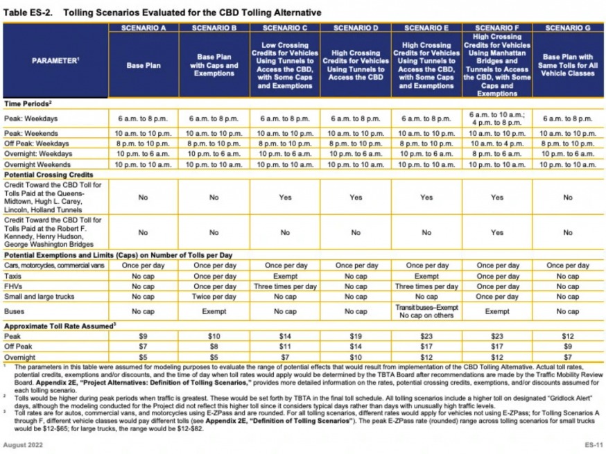 The assessment spells out, in seven different tolling scenarios, how much motorists may have to pay to enter Manhattan south of 60th Street — with potential rates for non-commercial vehicles ranging from $9 to $23 during peak periods and from $5 to $12 during the overnight hours.