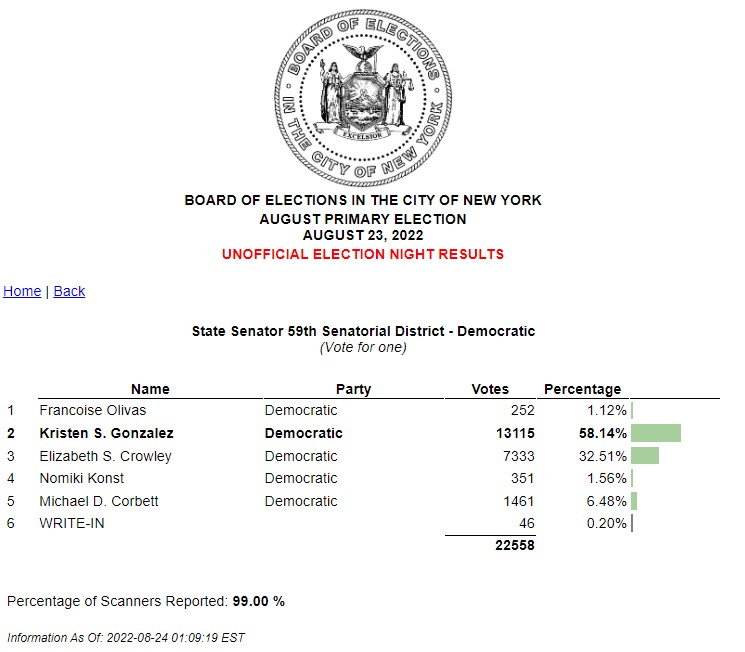 Kristen Gonzalez, a political novice and progressive candidate, has emphatically won the Democratic primary race to represent Senate District 59.