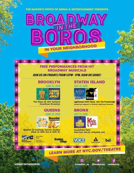 “After two long years, I am thrilled to see our city continue its reopening with the return of Broadway on the Boros,” Mayor Eric Adams said in a statement. “This remarkable series works to ensure that everyone in our city, regardless of their ZIP code, gets the chance to experience the magic of Broadway right in their backyards. Broadway is a lifeblood in our city, and this series is an incredible way for all New Yorkers to come out and relish in the magic that makes New York City’s heartbeat.”