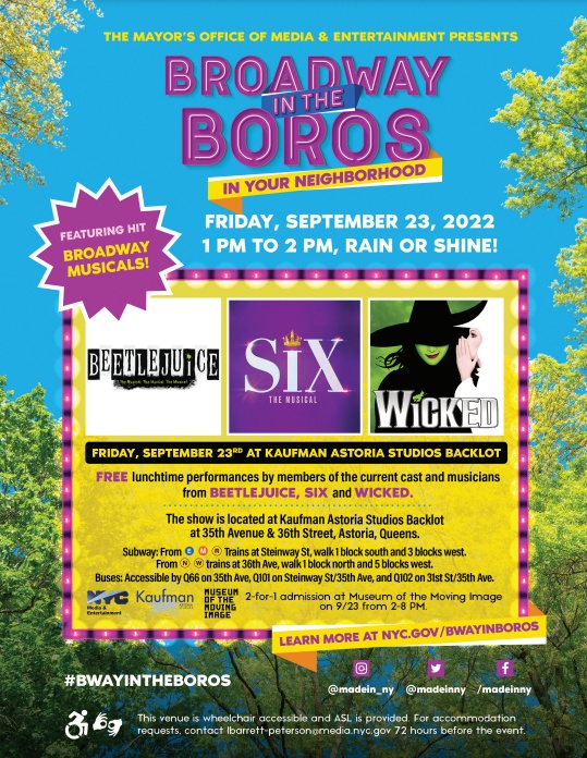 The family-friendly event, called Broadway in the Boros, will feature current cast members and musicians from hit shows such as Wicked, SIX, and Beetlejuice performing live, rain or shine.