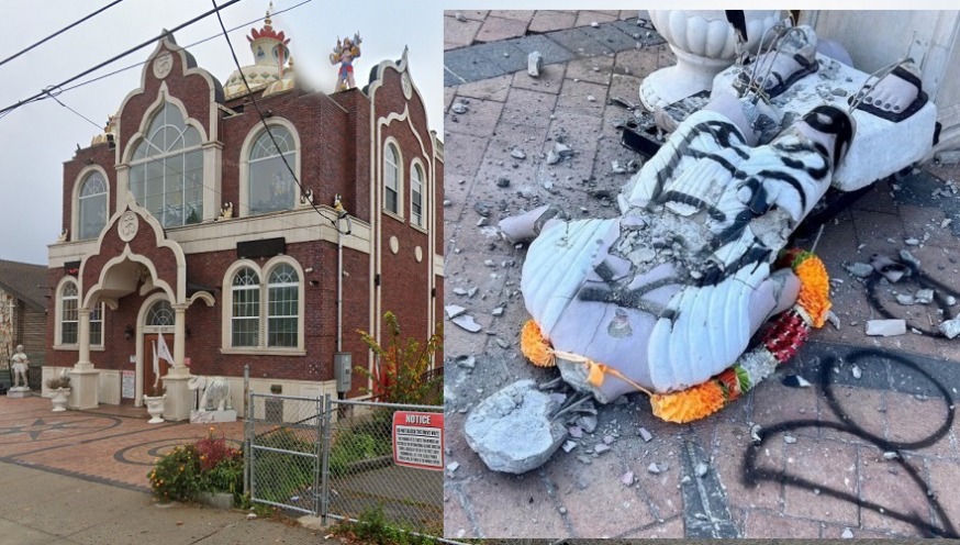 Police say that the statue, which was located outside Tulsi Mandi Hindu Temple at 103-26 111th St., was vandalized during the early hours of Aug. 16, with a temple priest discovering it that morning broken into multiple pieces along with the words “Kutta Dog” spray painted on it.