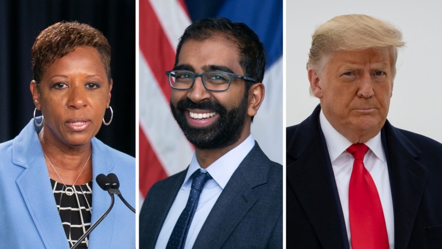 Council Speaker Adrienne Adams (L) and Councilmember Shekar Krishnan (C) have called on the Parks Dept. to nix the Trump Organization’s license to operate a golf course in the Bronx (Photos: NYC Council (L) Facebook (C) Trump White House)