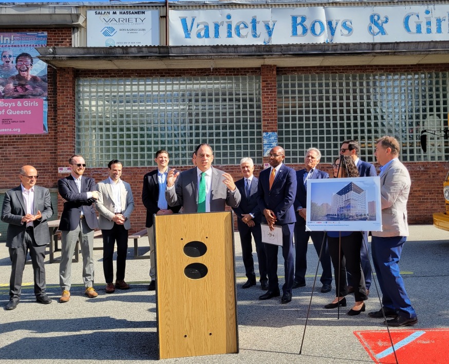 Officials with the Variety Boys & Girls Club of Queens were joined by Queens Borough President Donovan Richards to announce that their upcoming development will be designed to be carbon neutral. The photo is of Costa Constantinides, CEO of VBGCQ, discussing the project Tuesday (Photo courtesy of VBGCQ)