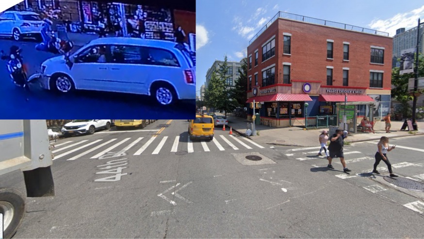 The video shows delivery worker Armando Escorcia, 28, riding his scooter northbound on 21st Street – at the 44th Drive intersection – at around 5:45 p.m. when a driver in a white-colored minivan traveling in the opposite direction suddenly plows into him. The driver of the minivan – a Dodge Grand Caravan — was attempting to turn left onto eastbound 44th Drive.