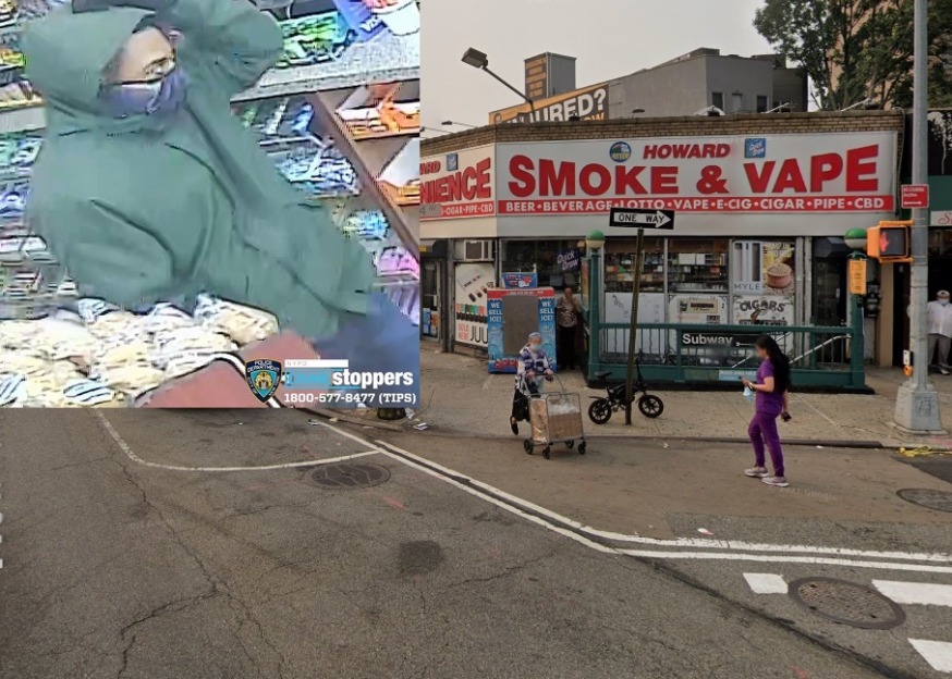 Police are looking for a man, pictured, who allegedly robbed a smoke shop in Rego Park at knife point last week (Photos NYPD and GMaps)