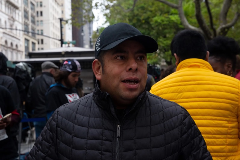 Deliverista Sergio Ajche speaks near a vacant newsstand outside City Hall.Ben Fractenberg/THE CITY