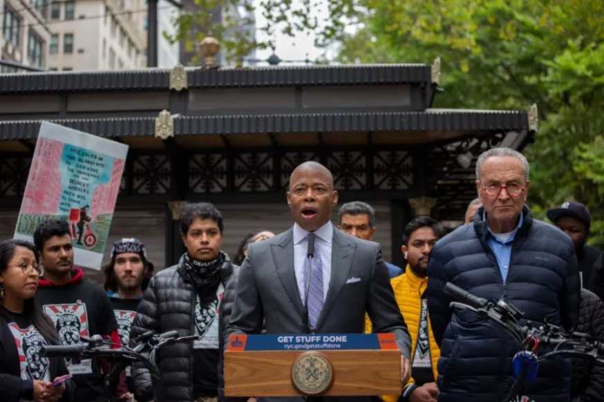 Mayor Eric Adams speaking outside City Hall with Deliveristas and Sen. Charles Schumer in front of a vacant newsstand. Ben Fractenberg/THE CITY