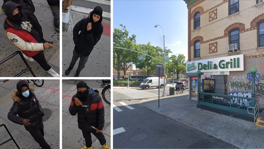 The police are looking for four suspects who used a cane and a stick to beat a 15-year-old boy outside a deli in Astoria Monday (Photos: NYPD and Google Maps)